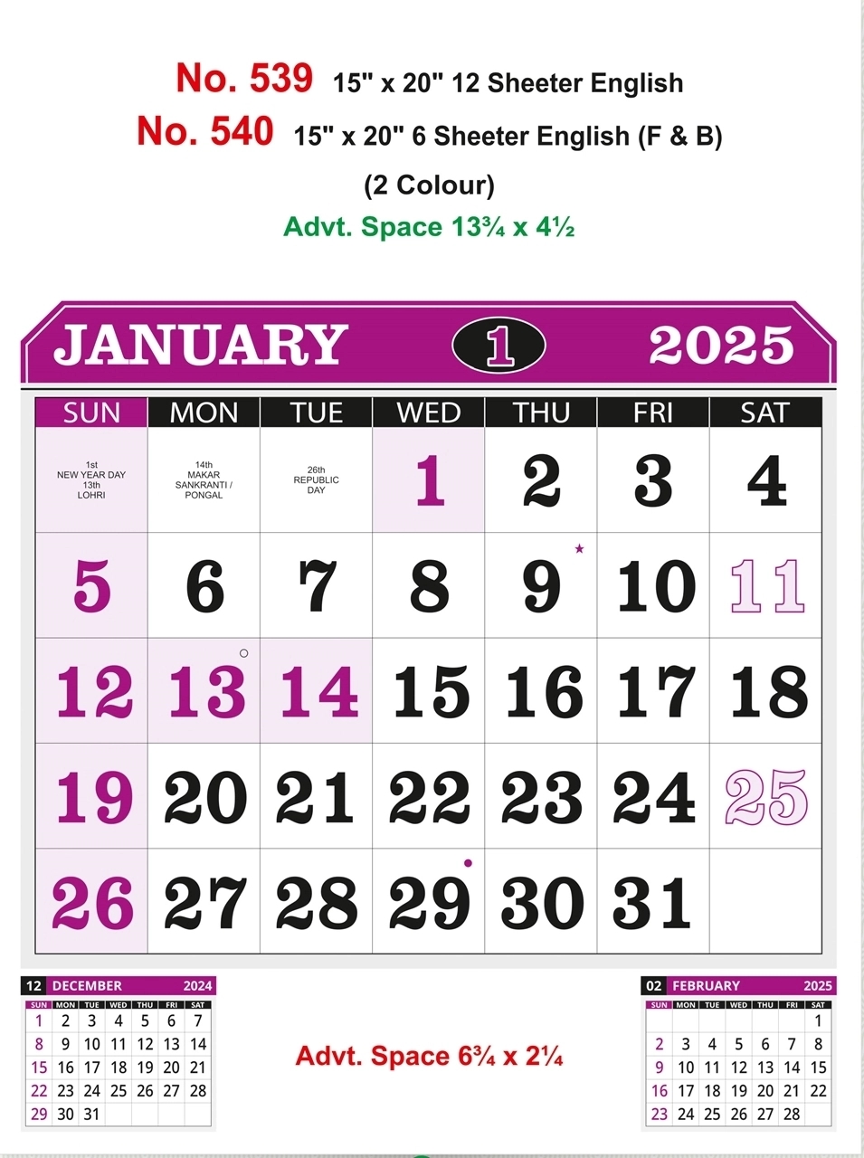 R539 English 15×20 12 Sheeter Monthly Calendar Printing 2025 Vivid Print India Get Your Jazzy Imagination Printing Online