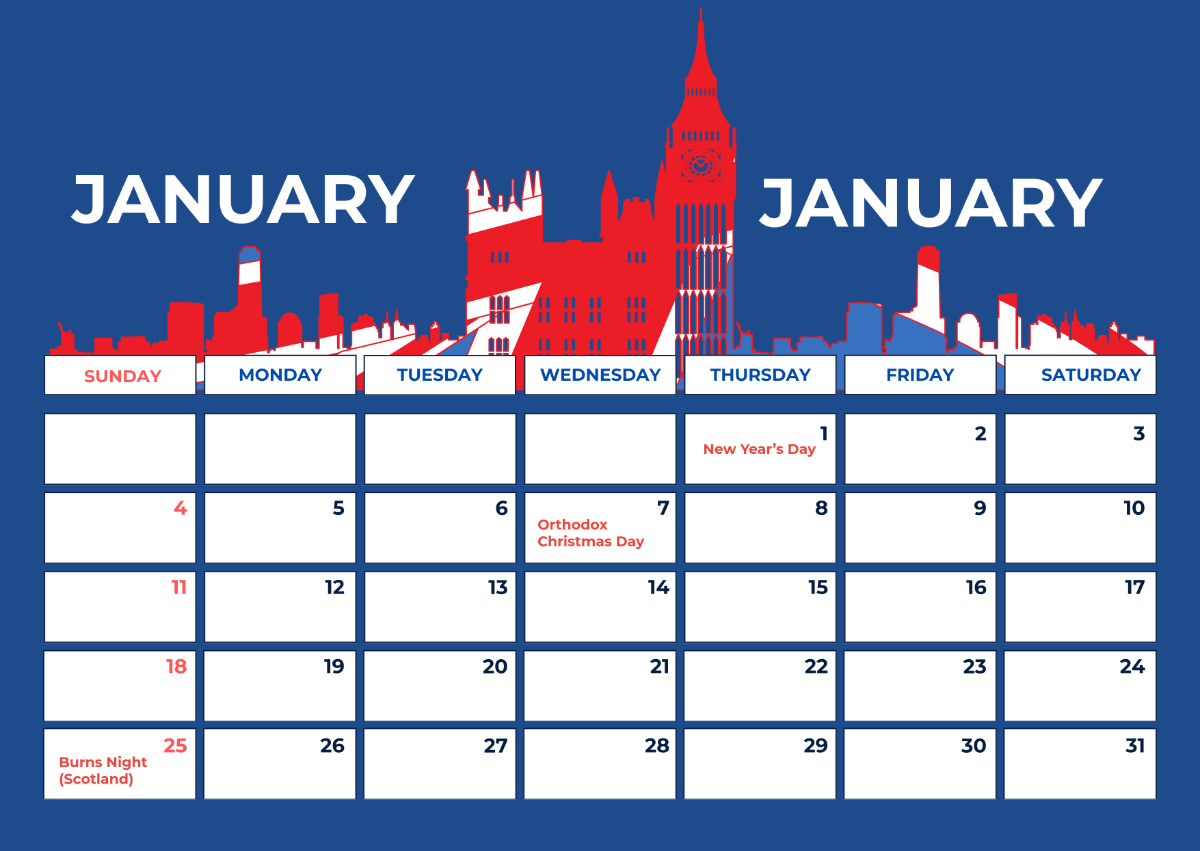Free January 2026 UK Calendar Template To Edit Online